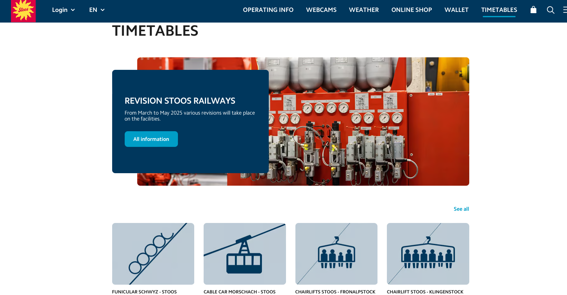 Stoos 村裡一共有上圖圖示的四種交通工具,開放與否會視維修或天候而定,如2025年雪季即將於四月底結束,四月初時,山上仍有積雪,往Fronalstock山頂的吊椅是開放狀態,往Klingenstock山頂的吊椅則是封閉狀態,建議事先上官網查詢,以免白跑一趟,請點此查詢。